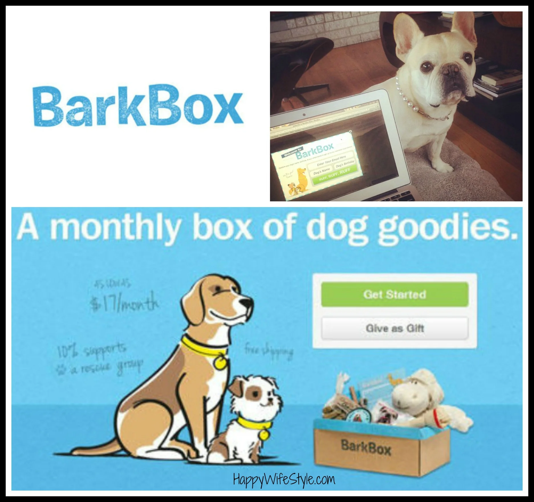 BarkBox is a monthly box of goodies for your pet! You can subscribe for as many months as you like... or just one time! You can also send a gift to another lucky pet! They offer free shipping and 10% of the money supports a rescue group! :)